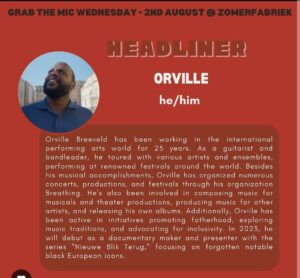 Orville was dagvoorzitter tijdens de zomeravond van het Nederlands Fotomuseum te Rotterdam. Het panelgesprek had als thema ‘Zichtbare Sporen’. Met curator Guinevere Ras, activist/singer songwriter